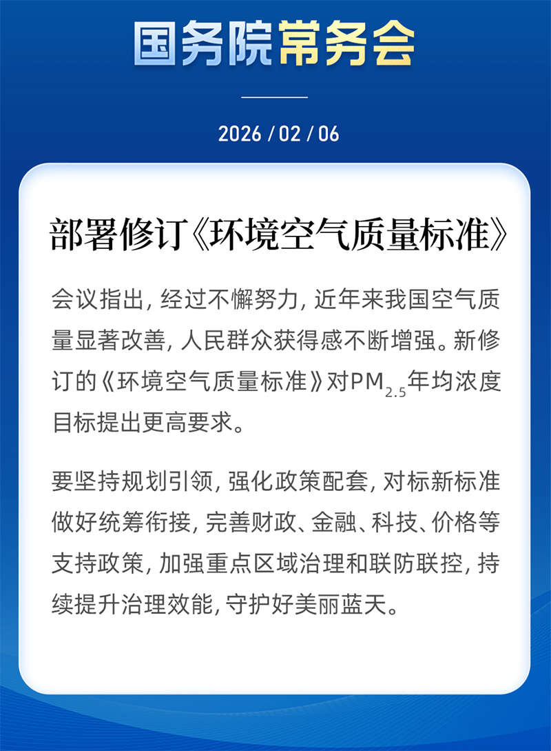 会议指出,经过不懈努力,近年来我国空气质量显著改善,人民群众获得感不断增强。新修订的《环境空气质量标准》对PM2.5年均浓度目标提出更高要求。要坚持规划引领,强化政策配套,对标新标准做好统筹衔接,完善财政、金融、科技、价格等支持政策,加强重点区域治理和联防联控,持续提升治理效能,守护好美丽蓝天。